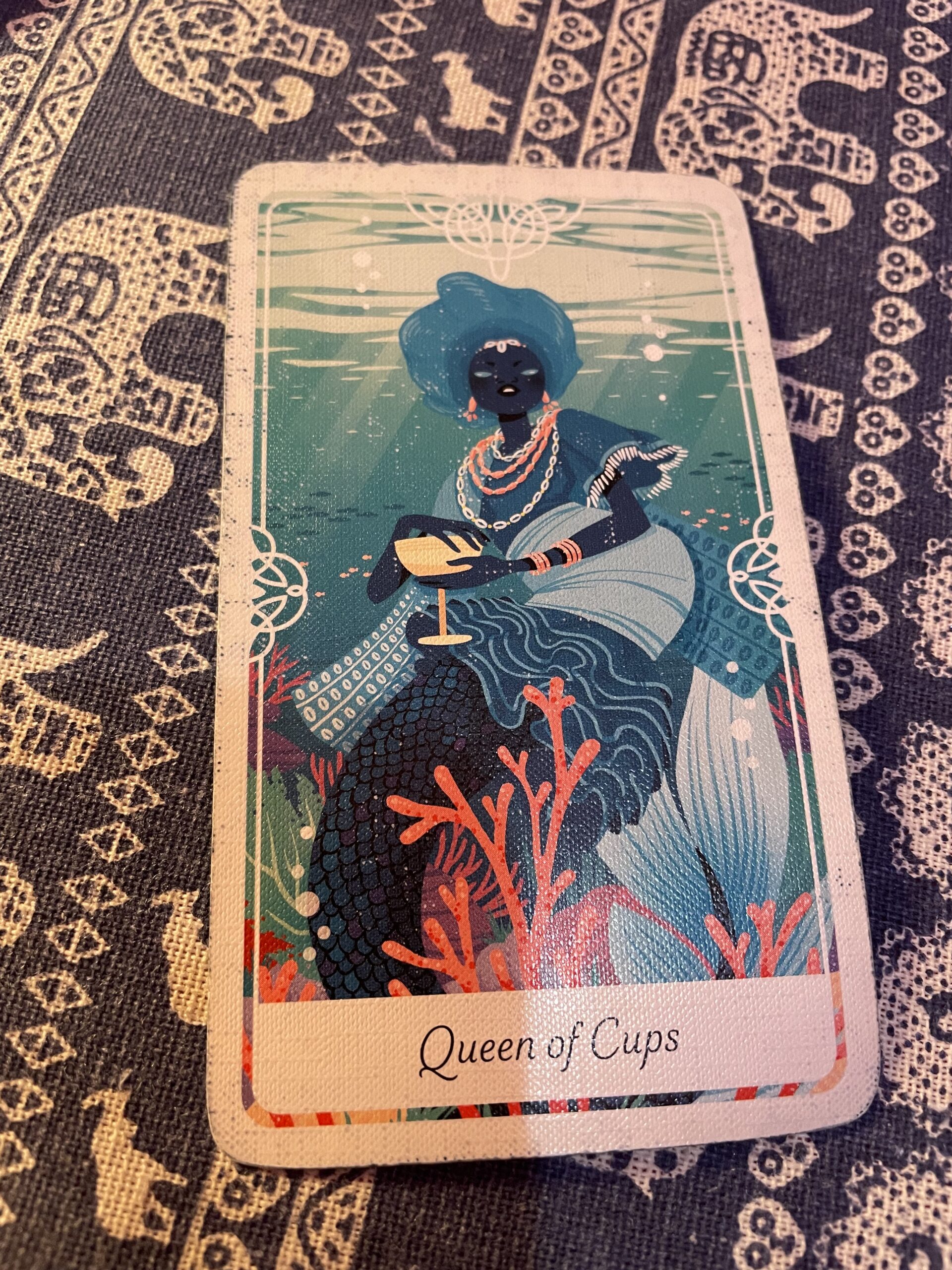 そこでオリシャのオロクンによって海の道へと導かれました。彼女は河川と表層水、つまり生命に満ちた場所を司るようになり、無数の子孫にちなんで「魚の母」イェイェ・オモ・エハと名付けられました。
