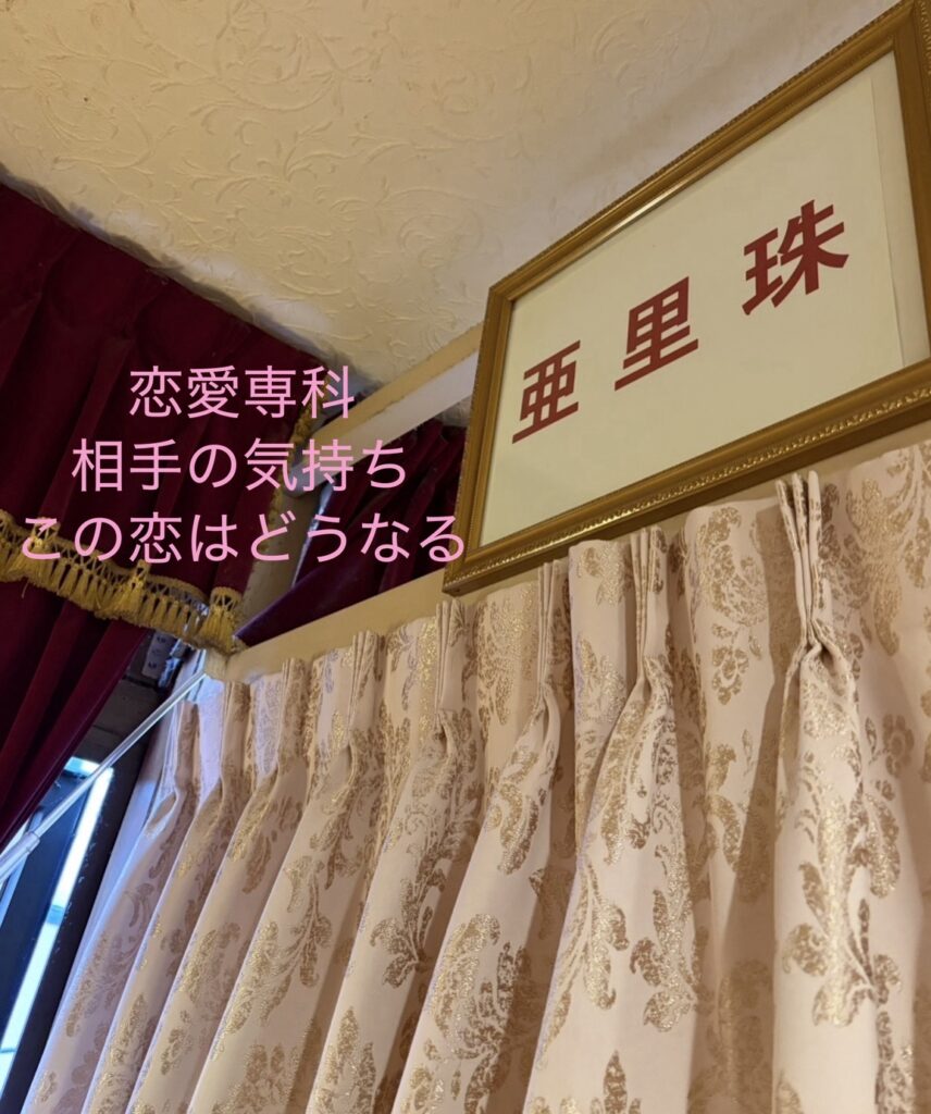 プロフィール弊館での霊感占いの元祖にしてオーソリティ!!鑑定キャリアの長さと、老若男女を問わない顧客の多さがその実力を物語る、まさに大御所というべき存在です。 相談者が今知っておくべきことや幸せになるための方法を、独自の霊感でスラスラと語る亜里珠先生。効果抜群の改善アドバイスは「もっと早く聞いておけばよかった!」と思うこと請け合い!相手の状況や復縁の時期が当たった、おかげで最良の道を選べた…など、恋愛に悩む女性や、芸能界、財界からも連日感謝の声が尽きない人気占い師。 真の幸せを共に追求してくれる、温かくひたむきな姿勢が評判です! ※メディア出演歴 関西テレビ、雑誌『女性セブン』『anan』『週刊女性』など多数。