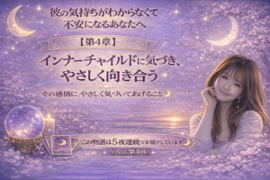 【第4章:インナーチャイルドに気づき、やさしく向き合う】 第3章では 潜在意識が現実に大きく影響していることを お伝えしました。 ⸻ その潜在意識の中でも 特に大きく関わっているのが “インナーチャイルド”です。 ⸻ イ … 続きを読む 彼の気持ちがわからなくて不安になるあなたへ【第4章】インナーチャイルドに気づき、やさしく向き合う🌙