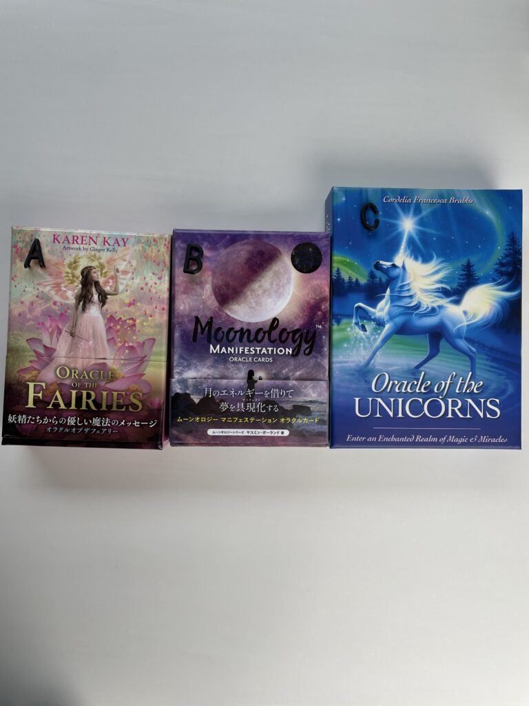 本日は、「見た時がタイミング!3択ワンオラクルリーディング!!今のあなた様に必要なメッセージ」です。左からABCのお好きなオラクルカードの箱をお選びください♪