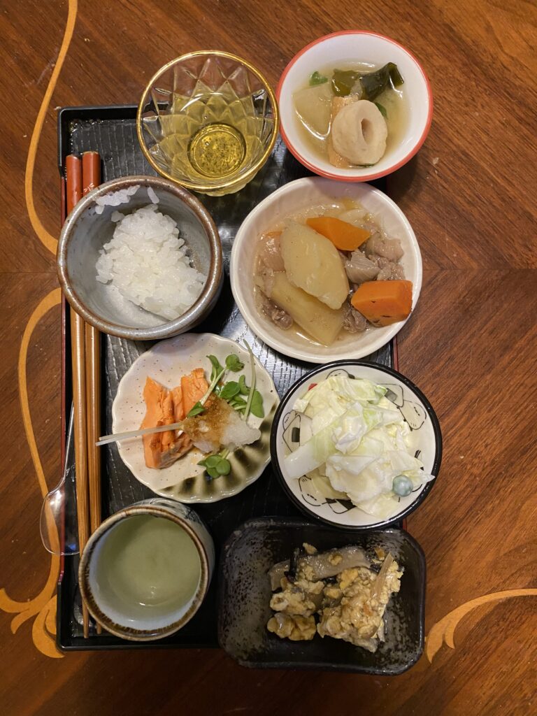 毎日私が食べる料理をお供えします。写真はご飯にお味噌汁、鮭、肉じゃが、ポテサラ、カニ玉、ビールとお茶🍵🍺