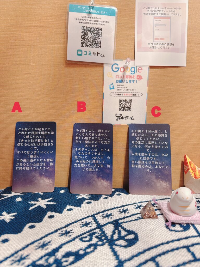 本日はありがとうございました。T様の初めての占いに携われて光栄です。また何かございましたら、お気軽にご相談くださいませね。