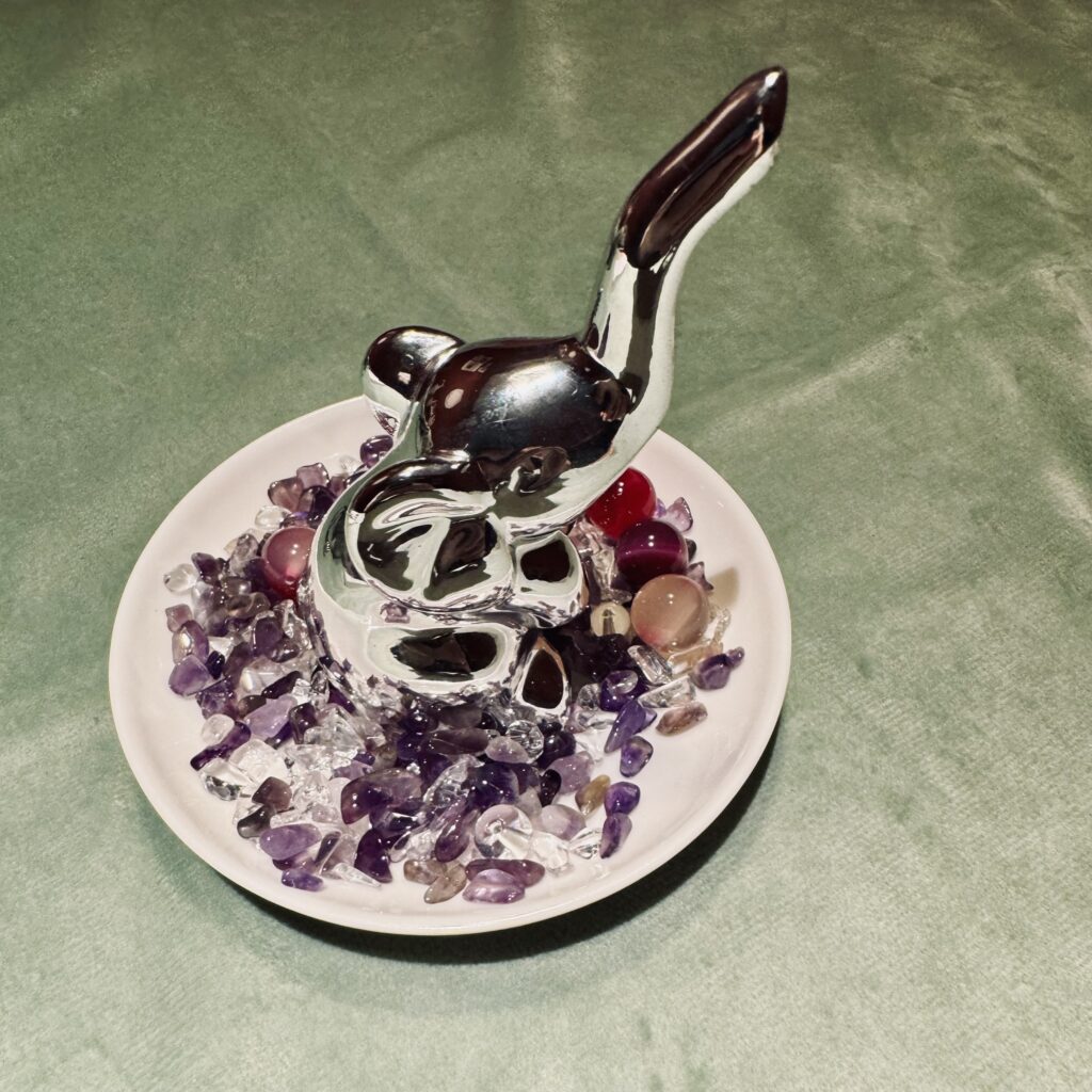 ゾウさんのアクセサリー置きに水晶とアメジストのさざれ石を置いてます。