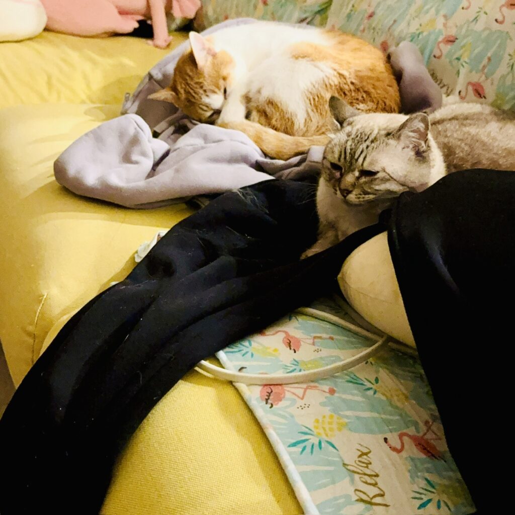 ⬆️いつもの時間に帰宅したない人がいて寂しいのか、プチ実施した家人の服を広げてくつろぐニャンズ。