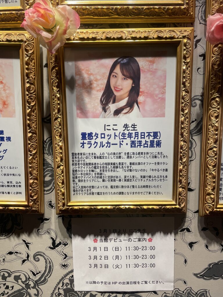 プロフィール霊能者家系に生まれ、人の“心の奥の声”を感じ取る感覚を持つにこ先生。 某有名占い店にて看板鑑定士として活躍し、選抜メンバーとして活動してきた実力派です。 経営者や芸能関係者からの相談実績も豊富で、番組出演のオファーを受けタレントやアイドルの鑑定を担当した経験もあります。 霊感タロットを軸に、本音を引き出し、 「なぜ動けないのか」「今やるべき最短の一手は何か」を明確に。 結果やアドバイスの的確さに定評があり、涙で入室し、笑顔で帰られる方も多数。 現状をクリアにし、願いを実現へ導く実践型スピリチュアルカウンセラーです。 ※ご入室時の状態によっては、鑑定前に数分ほど整えるお時間をいただく場合があります。 よりクリアな状態で鑑定を行うための調整となりますのでご了承ください。