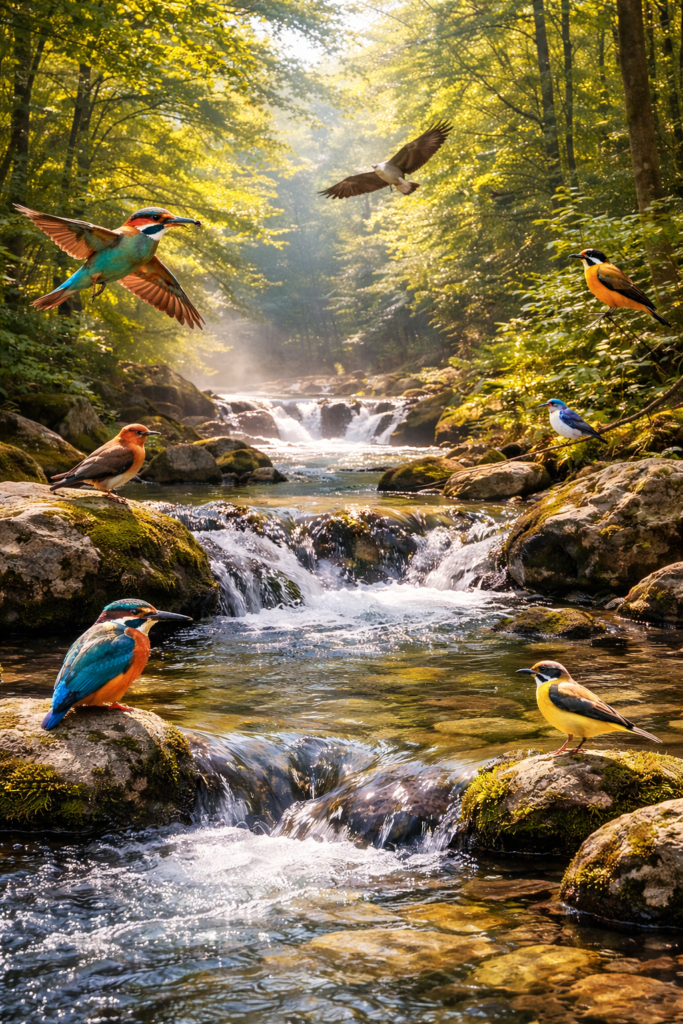 自然の水の音と鳥の鳴き声で