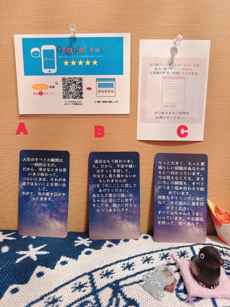 本日はありがとうございました。T様の初めての占いに携われて光栄です。また何かございましたら、お気軽にご相談くださいませね。