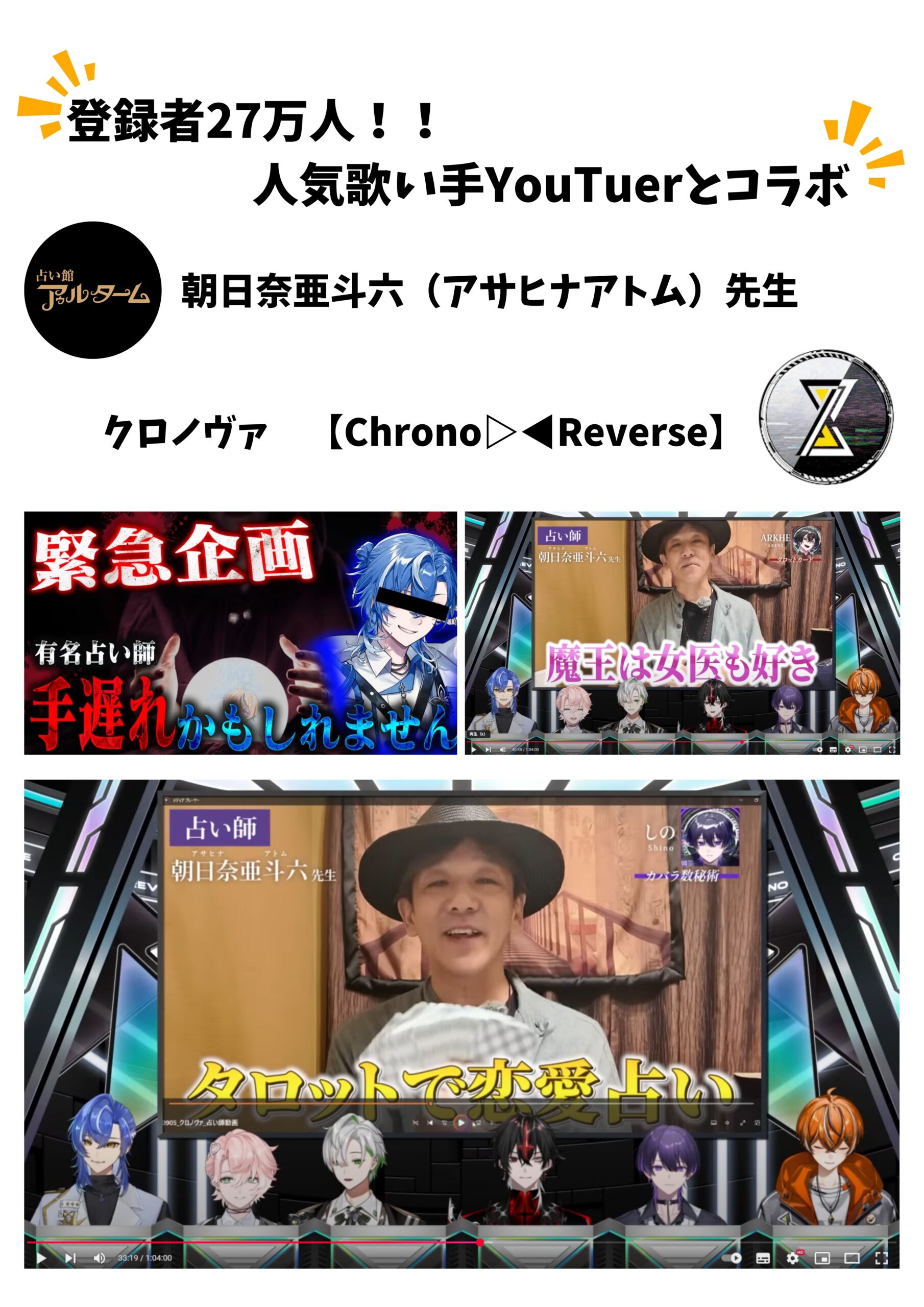 只今、人気急上昇中の注目株!!鋭い視点と的確なカードリーディングで、驚異の的中を実現! 朝日奈先生の手にかかれば、とりまく状況や相手の本心、核となる問題点が、見事なまでに丸裸に。そこから弾き出される具体的な秘策は、効果絶大!最短ルートで、願望成就に導きます。 生まれ持った感性を人々の救済に充てることこそが自身の使命と気づきさらに、独自のリーディング術をも開眼。 「好転できない状況はない!」を信条とし、ネガティブな感情を取り除くパワーを持つ、朝日奈先生。わかりやすく温かい口調が好評の、実力派占い師です! 〜メディア出演〜 ※一部名称をクリックすると外部サイトへジャンプします。 ・YouTube 「ラファエルRaphael」「ウマキんグ」「クロノヴァ【Chrono▷◀Reverse】」チャンネル