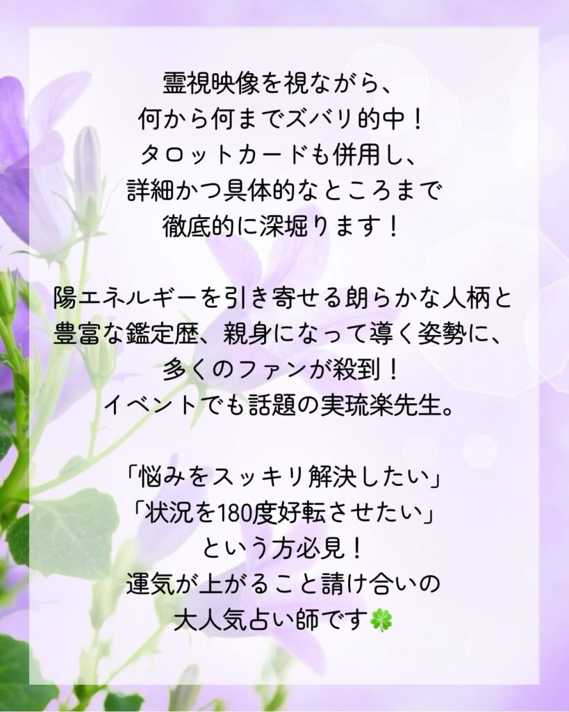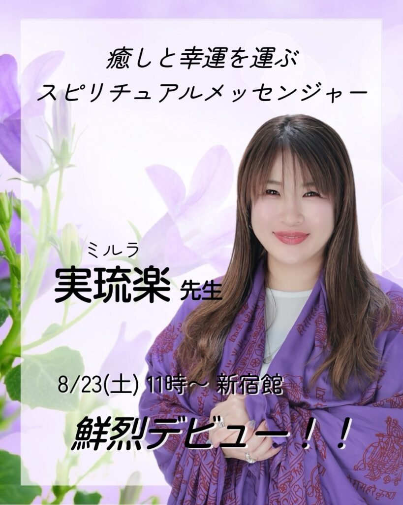 彗星のごとく現れた、癒しと幸運を運ぶスピリチュアルメッセンジャー!各種イベントや某有名占い会社で人気を博した実琉楽先生。満を持しての弊館デビューです!