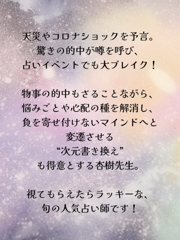 幸運を引き寄せ、望む未来の実現を強力サポート!イベントでも引っ張りだこの人気占い師!満を持しての弊館デビューです!